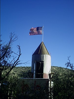 The sky castle with tower, the orange Chevy and my baby girl Pekoe in the foreground.